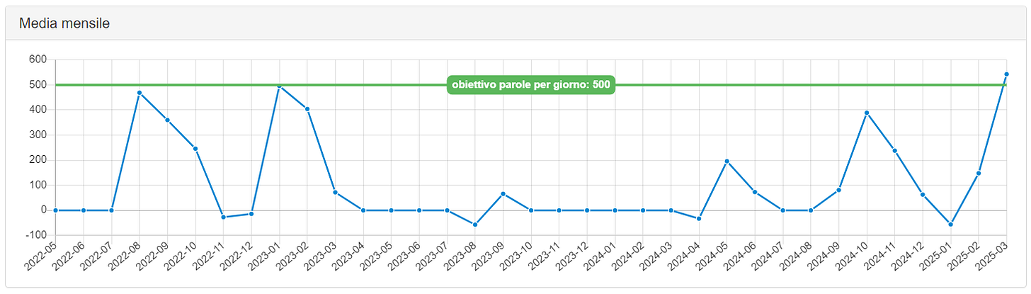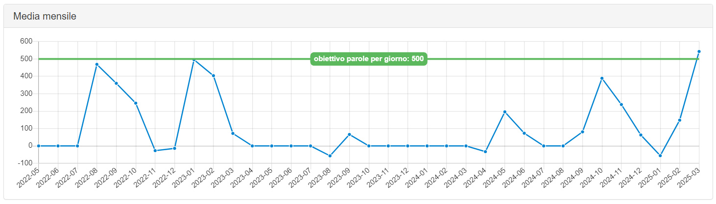 Questo mese, però, ho scritto con una costanza eccezionale – per i miei standard, si intende – come si vede da questo pratico grafico, che mostra la media mensile delle parole scritte al giorno: