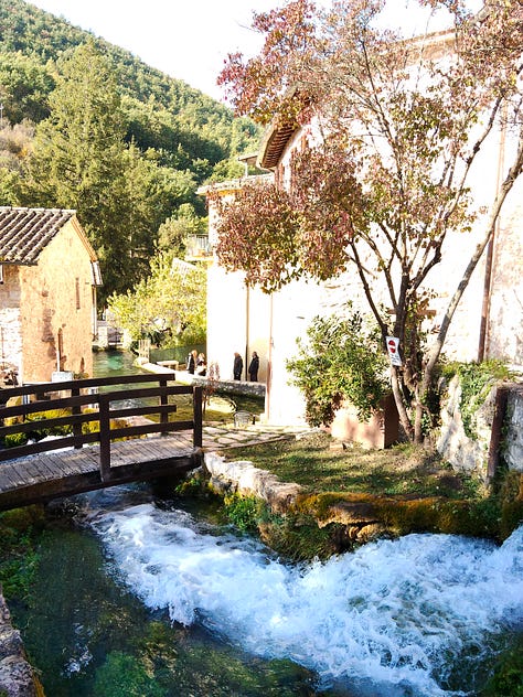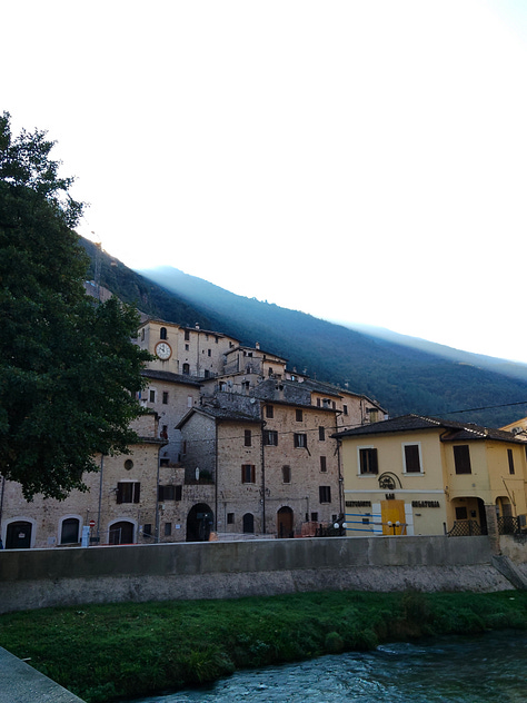 L’ultimo giorno, sulla via del ritorno, abbiamo fatto sosta a Scheggino. Le acque sono state un po’ il leitmotiv involontario del viaggio, e infatti anche questo paese sorge sulle sponde di un fiume, il Nera. Ci siamo arrivati prima ancora del sole, visto che è costruito a ridosso di una montagna: eravamo gli unici turisti, e abbiamo portato un po’ di rumore nei suoi vicoli silenziosi che odoravano di camini accesi.