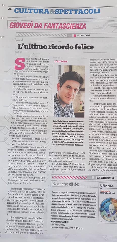 Nel 2021, a seguito dell’affermazione al Premio Urania Short, venni invitato da Franco Forte a partecipare con un mio racconto alla rubrica “Giovedì da fantascienza” del quotidiano Il cittadino di Lodi. Scrissi così L’ultimo ricordo felice, un racconto dalle sfumature cyberpunk lungo una sola pagina. Curiosità: per un errore della tipografia, le ultime due righe del racconto non andarono in stampa.